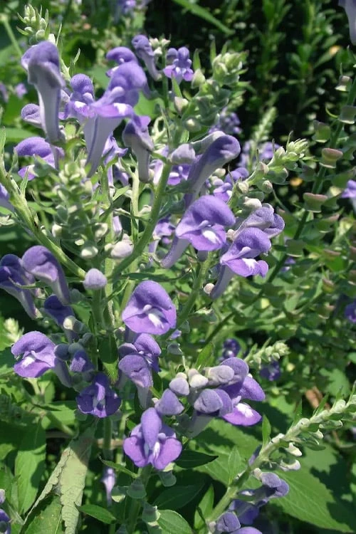 A delightful North American native, Scutellaria incana, commonly called Downy Skullcap, is a super tough but lovely perennial wildflower that is very easy to grow. It forms a bushy plant to 3 feet tall and 2 feet wide with erect stems topped in racemes of very pretty flowers that the hummingbirds, butterflies and other beneficial pollinators will thoroughly enjoy. Blooming from early summer to early fall each long, tubular, violet-blue to sapphire-blue nectar-rich flower has an entrance with a hood- or cap-like overhang at the top, and a floor with a white pathway that beckons pollinators who might help pollinate the flowers. Aside from feeding on the nectar, pollinators will also enjoy the pollen in the flower for the protein and lipids it provides. The stamens and pistils are hidden under the hood as well so after getting a drink of nectar at the depths the pollinators get some pollen from under the hood. Needless to say, this plant is a pollinators dream plant, and easy to look at too. Downy Skullcap thrives in sun or part sun and prefers a moist but well drained fertile soil but tolerates drought and poor soils. Selected as NC Wildflower of the Year by the North Carolina Botanical Garden.
